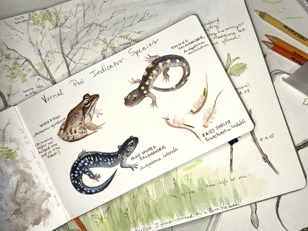 Then I googled and found there was a site that could help me locate vernal pools in my area. So I used the map and found there was a vernal pool at the University of New England, Biddeford campus, right where I work. (I’m an art professor there.) While this was for sure a vernal pool, there were no more egg masses and the frogs and salamanders were more vocal and then visual. I visited this vernal pool several times and spent time watching a Pileated Woodpecker, listening to the wood frogs, tree, frogs, peepers, and bull frogs, and the peace of the landscape.